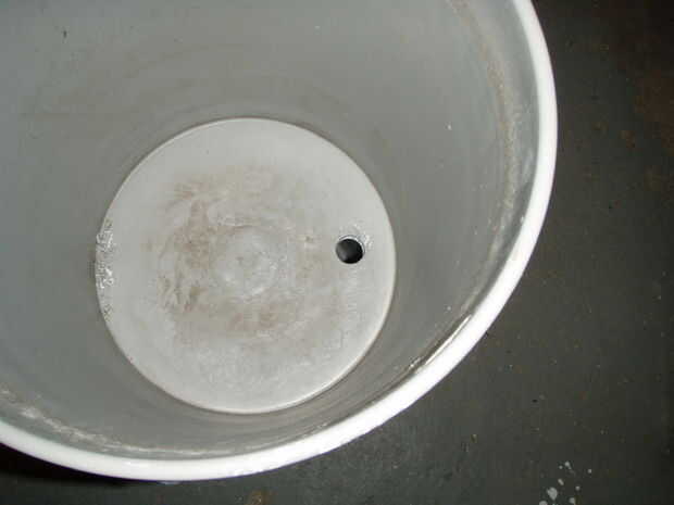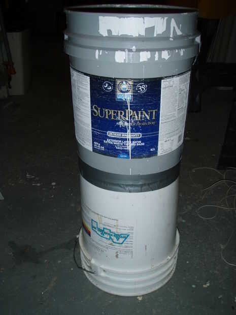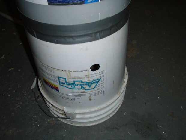 Comience con dos baldes de 5 galones. Los cubos juntos, inferior a inferior de la cinta y perfore un agujero piloto a través de los fondos de ambos cubos. También puede quitar el mango de la cubeta inferior porque tiende a ponerse en el camino.