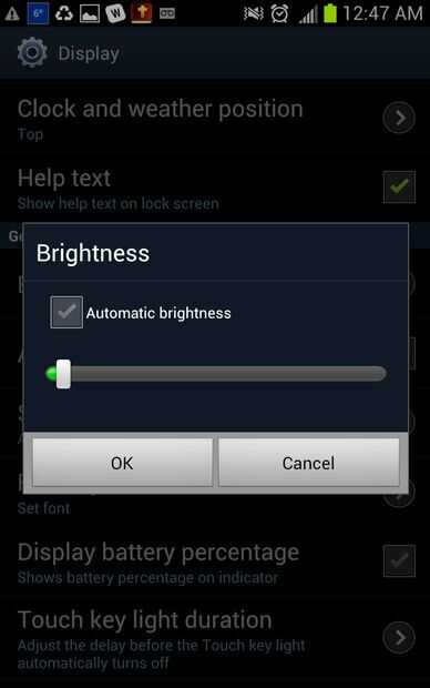 (Brillo de la pantalla de configuración»») Mayoría de la gente puede ver un Android pantalla bastante bien con la función de retroiluminación apagada. Mueva el control deslizante hacia la izquierda, y luego intente usar el dispositivo de esa manera. Si usted no puede ver bien en esa configuración, mueva el control deslizante a la derecha sólo lo necesario para ver la pantalla cómodamente. Por otra parte, brillo automático juntada con (se encuentra en la mayoría de Samsung, LG, Sony y algunos dispositivos de Motorola) el modo de ahorro de energía conservador ajuste la pantalla a los alrededores a sólo el brillo necesario.