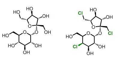 Pues bien, los átomos de cloro hacen mucho más sucralosa hidrofóbica (aceite-gusto) de un azúcar ordinario como la maltodextrina. Así, utilizando un solvente no polar como acetona o isopropanol la sucralosa puede ser disuelto y la maltodextrina se filtra apagado.