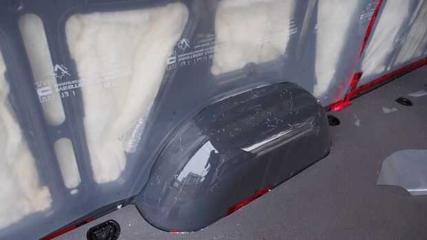 Hemos tenido algunas salidas de corte más delicados hacerlo alrededor de los montantes del techo y en el anclaje posterior de la puerta. Con paciencia y buenas tijeras, todo puede ser sellado hacia fuera correctamente!