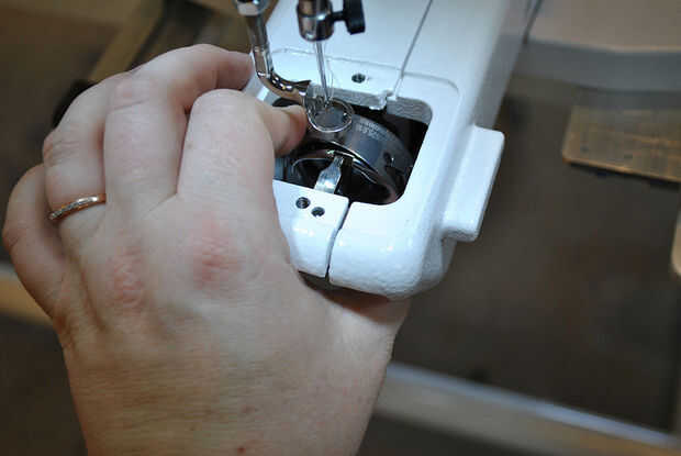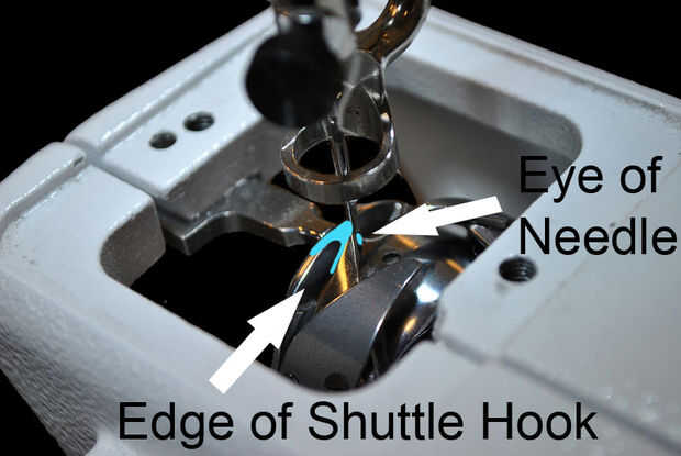 Una vez que la aguja hacia abajo, gire la parte exterior de la lanzadera hasta el punto del gancho está justo encima del ojo de la aguja.