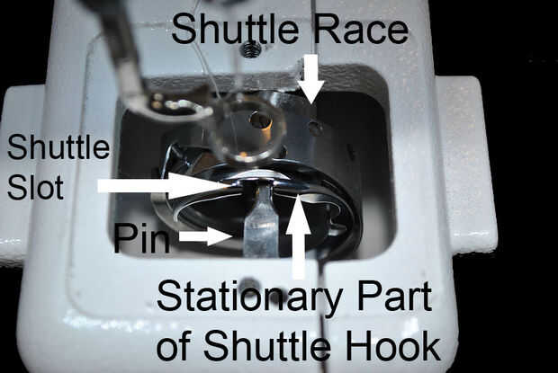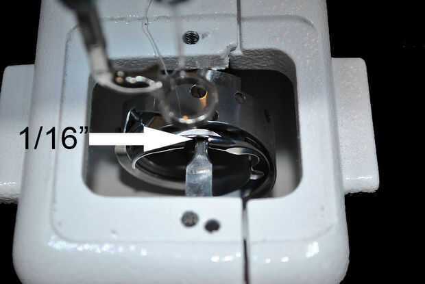 Debe haber una abertura entre la parte superior del perno y la parte posterior de la ranura de la lanzadera. Varía entre máquinas, pero debe estar en algún lugar alrededor de 1/16" o menos. Realmente desea que lo suficiente de una apertura do el hilo puede venir a través después de pasar alrededor de la canilla.