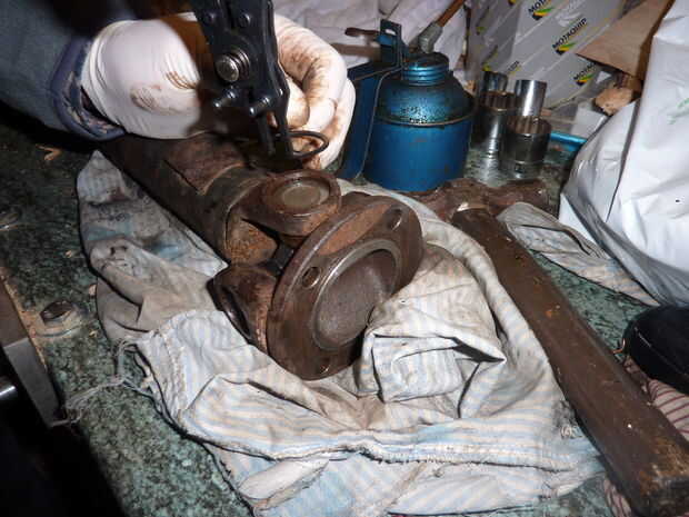 Lo mismo para el árbol de transmisión como para la silla de montar. Retire los tapones, alinear con la articulación y golpeó el árbol de transmisión hacia abajo en la tapa (Foto 1). Repita en el otro lado. Golpear las tapas de abajo más utilizando un socket y un martillo,(Photo 2) hacer esto hasta que usted puede sentir los cantos. A continuación, inserte los anillos de seguridad asegurando que están completamente en el uso de un destornillador pequeño. (Foto 3)