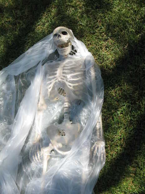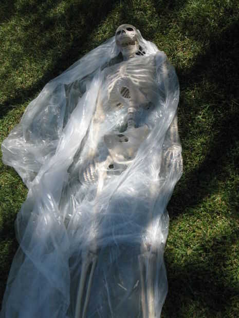 Después de que has envuelto en una capa o dos de plástico (y está totalmente bien tener dos capas y una capa en algunos lugares en otros lugares), desea sacar su pistola de aire caliente. Esencialmente, usted está enfundado retráctil el esqueleto en lona plástica. Si usted se quema a través de la lona que está totalmente bien. Los más "agujeros" en su carne, la más realista parece.