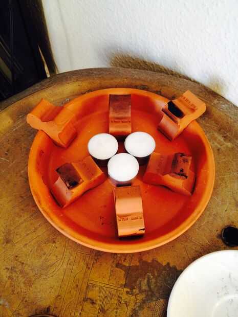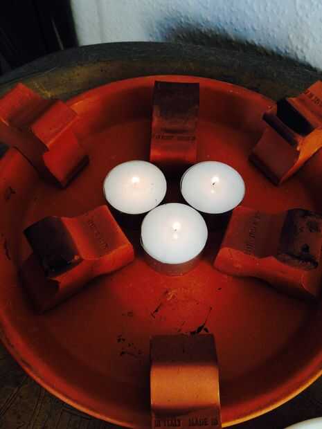 Puede usar 4 horas tealight velas o para mejores resultados la 8hours unos. Asegúrese de que la llama comienza en el borde del olla en el siguiente paso para el mejor oxígeno al revés dibuja como se muestra. A esta escala utilizar 3 velas. NO USE VELAS AROMÁTICAS U OTROS. TE RECOMIENDO 8 HORAS TEALIGHT CLARO. Un paquete de 75 fue £3,99... ADVERTENCIA algunas velas HUMEARÁ cuando consiguen demasiado caliente... ME ENTERÉ DE ESO SI USTED ESPACIO LES APARTE UN POCO NO CALIENTAN LO SUFICIENTE COMO PARA EMPEZAR FUMAR...