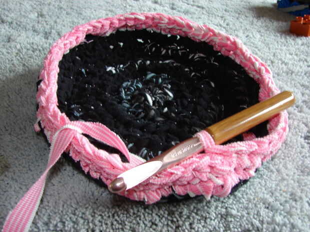 una buena manera de pasar una tarde o perezosa noche delante del televisor! Esta cesta es de camisetas viejas que se hacen en una trenza y cosida. Le tomará unas horas para hacer una canasta, pero es bastante fácil. Y es una gran manera de utilizar v