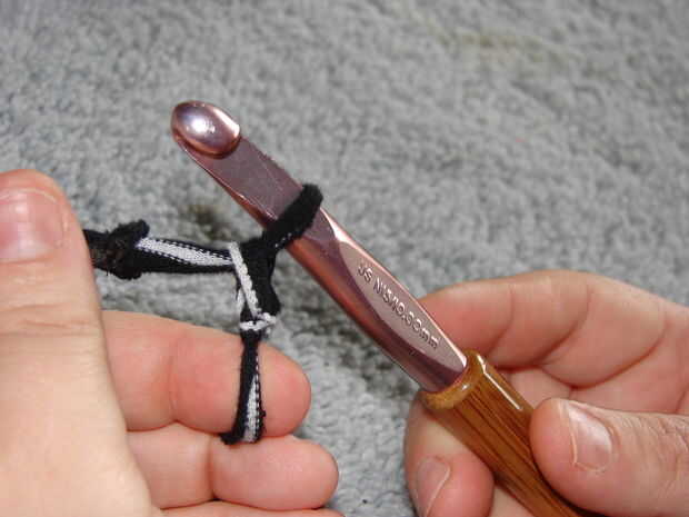 Ahora vas a cadena tres. Para hacer esto poner el hilo sobre la aguja y a través del bucle do esto tres veces.