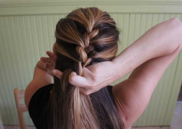 Continuar alternando las secciones abajo de la cabeza. Cruzar otra sección de la derecha a la mitad, luego coge una nueva sección sobre derecho y combina con sección cayó. A continuación, cruzar sobre una sección de izquierda media, una nueva sección en la izquierda del gancho agarrador y combinar. Seguir todo el camino hasta que no pelo a la izquierda para agarrar de la cabeza y continuar con una trenza regular.