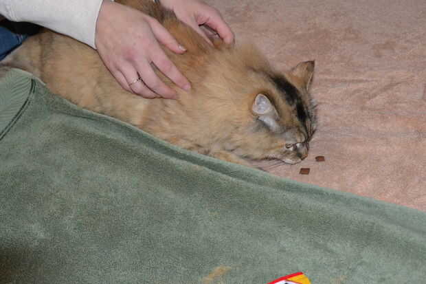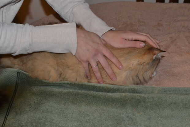 Antes de la preparación me gustaría dar a mi gato un par de golosinas mientras está sobre la mesa y le acaricie durante unos minutos. Esto ayuda a calmar sus nervios y me dan una persecución para ejecutar mis manos a lo largo de su capa para comprobar cualquier grupos o áreas grasosas.