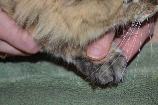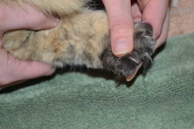 1) Sostenga una pata en una mano y presione suavemente en un cojín del dedo del pie para extender una garra.