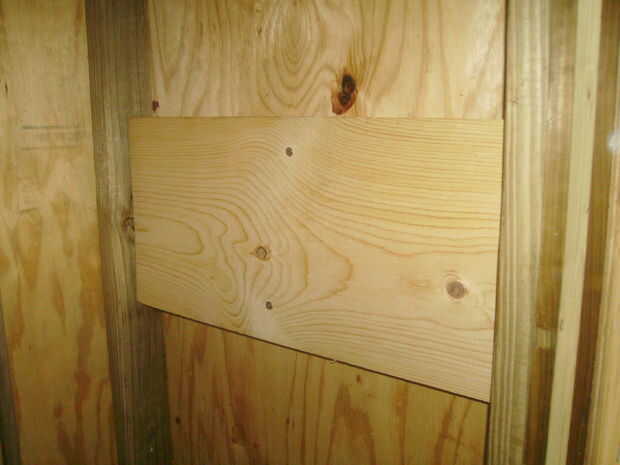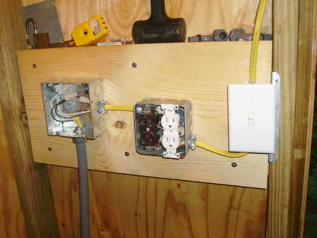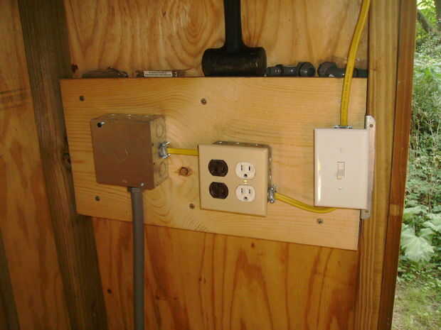 Despues de decidir el mejor lugar para la caja de conexiones, yo construí un panel donde tener todos los accesorios cerca: la caja de conexiones, los tomacorrientes y los interruptores para el sospechase. Despues de taladrar "juntas de bolsillo" at dos piezas de 2 x 4, las atornillé una dos vigas Chávez de columnas en el cobertizo. Luego atornillé un panel de ¾ de pulgada (1,9 cm) sobre los 2 x 4.