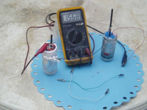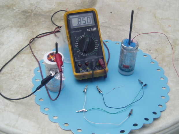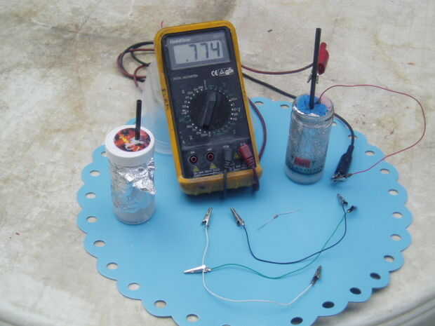 Primero medimos el voltaje de cada batería. Entonces nos conéctelos en serie conectando el cable negativo (conectado a papel de aluminio) al cable positivo de la otra batería.