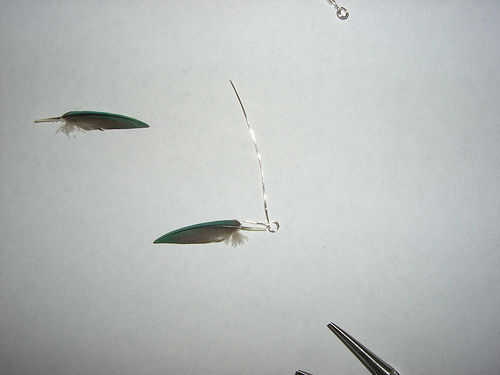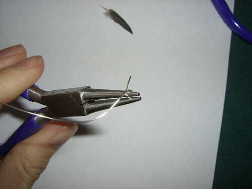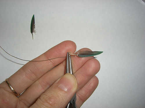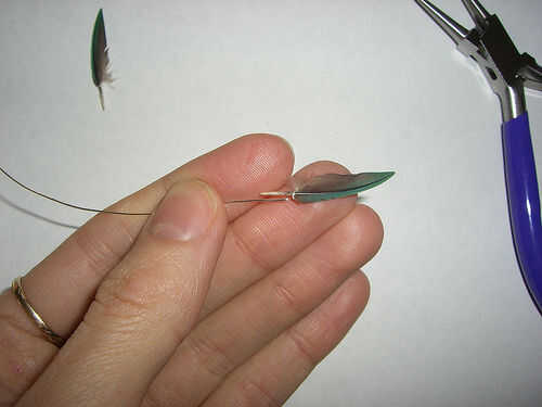 Desea el extremo corto para ser sobresale del bucle, como se muestra en la foto, para que la pluma se cuelgue hacia abajo. Cable de calibre pequeño es fácil de doblar, sin embargo, por lo que si las cosas no son totalmente rectas cuando finalice, se puede ajustar cuando termines con la envoltura.