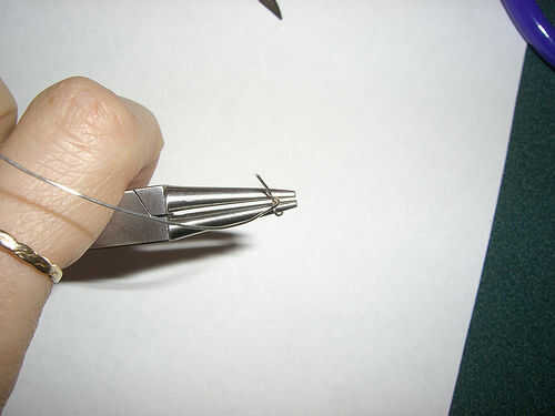 Después de envolver el cable una vez alrededor de los alicates, doble el extremo largo del cable en la dirección vino de, por lo que envuelve el extremo corto (fotos 4 y 5). Esto hará más fácil empezar a envolver el extremo largo del cable alrededor de la pluma en el paso siguiente. Debe haber un poco de un espacio donde se cruza el alambre largo sobre el corto; se inserte la punta del eje de la pluma en esa brecha.