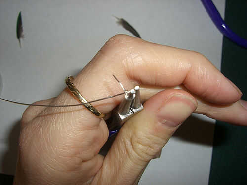 En el ejemplo mostrado, se trataba de una pequeña pluma (no recomiendo usar una pluma pequeña para su primer intento, es difícil aferrarse a), así que quería tener casi tanto alambre sostenido contra la pluma como había eje pelado de la pluma.
