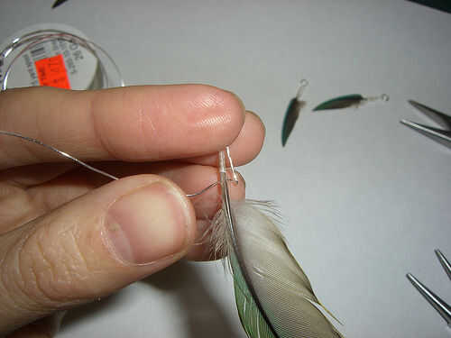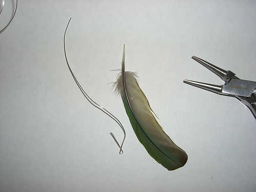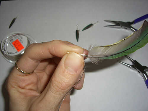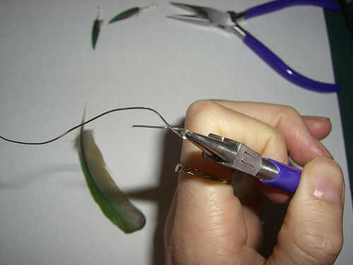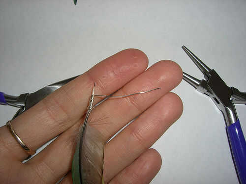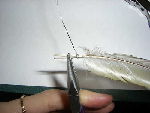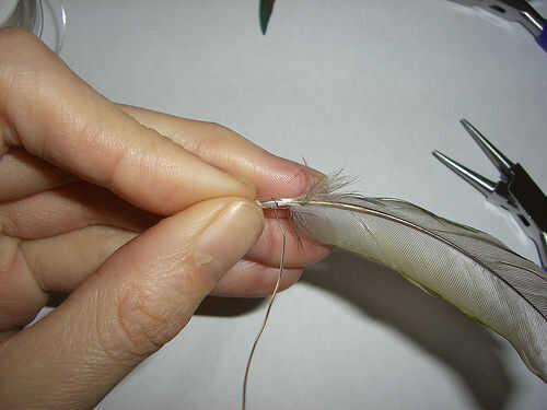 El eje de la pluma será probablemente más grueso que el alambre, así que agarrar con las pinzas puede ser complicado porque cuando la pluma se mantiene, el cable no es y tenderá a caer libre - tienes que pellizcar realmente duro, que tienden a aplastar el eje de la pluma, así que es del mismo grosor que el cable - pero eso está bien! Usted no verá ningún daño cuando se hace!