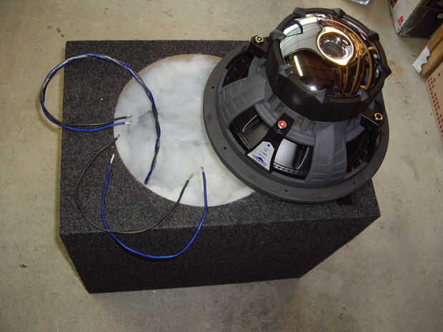 El subwoofer Kicker CVX se cargarán dentro de la caja ventilada. Este subwoofer está diseñado para ser usado con una sellada o una caja ventilada, sin embargo una ventilación (a veces conocido como portado) recinto se utiliza para este instructable. Llene la caja de subwoofer con Poly-Fil. Extienda el relleno en el interior de la caja. Adición de Poly-Fil simula una caja más grande, que se traduce en graves más profundos. La caja estaba llena de Poly-Fil para mejorar el sonido emitido por la caja de sub, así como optimizar el rendimiento del subwoofer. Porque el cuadro tiene ventilación, el Poly-Fil fue adherida a la caja con un adhesivo en aerosol para evitar de ser expulsado de la ventilación durante el uso. Una sección de 2 pies de cable 12 calibre era soldada en la parte posterior de los terminales de la caja para proporcionar una conexión segura.