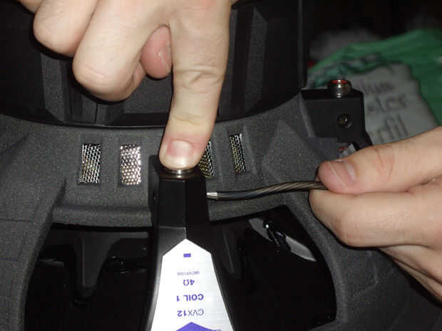 Luego, empuje hacia abajo la primera terminal positiva e Introduzca el extremo pelado del cable azul (positivo).