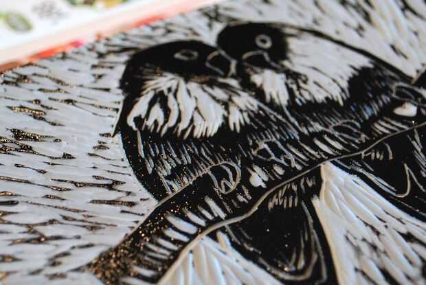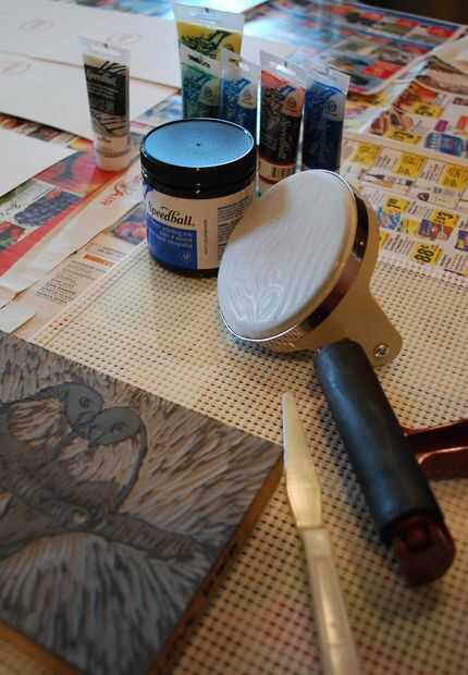 Ruede el rodillo hacia adelante y hacia atrás en diferentes direcciones para asegurarse de que cubra todas las partes de su bloque de linóleo. Le doy un rápido vistazo del lado a buscar el "brillo" de la tinta para que pueda ver si echaba de menos alguna mancha. Volver a rodillo de tinta en el rodillo y volver a rodar el bloque si es necesario.