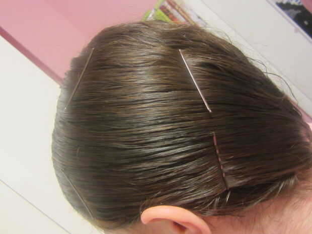 Tomar una sección de la parte que dejaste suelto y cepillo recto contra su cabeza. Poner en las horquillas cada tan a menudo. Traer esa hebra de pelo alrededor de su cabeza, asegurándose en mantener cepillado antes de la fijación lo.