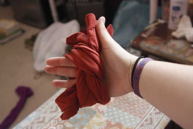 El extremo hacia abajo se muestra como la correa diagonal entre mi dedo índice y el pulgar en la foto, envuelta en los lazos y debajo de ellos, sacando un extremo muy corto en la parte inferior izquierda. En otras palabras, simplemente Envuelva el resto de la parte más larga alrededor de sí mismo y volver a donde estaba, donde enfrentarán diagonalmente a la mano.