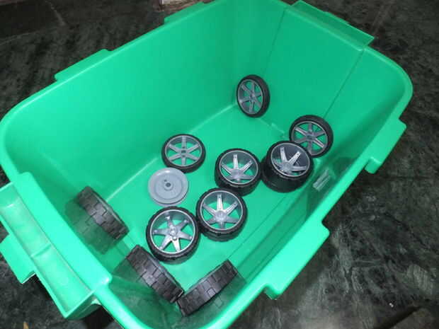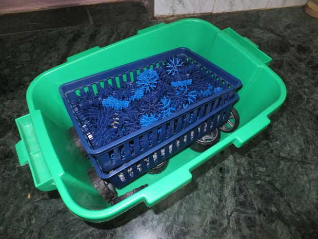 Como el título indica. Las ruedas están en la parte inferior y los conectores 3D son mantenidos en cajas separadas encima de ellos.