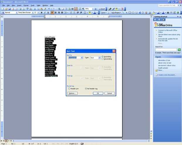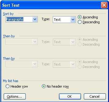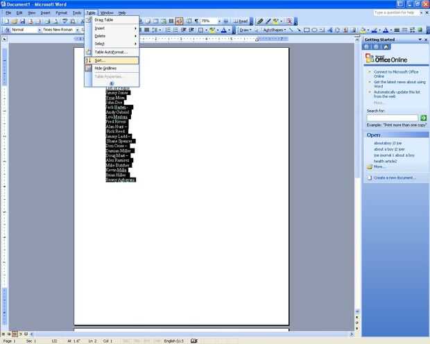 Ahora, después de destacar el texto haga clic en el menú tabla y ordenar. Cuando estás en el cuadro de diálogo ordenar eligieron ordenar por palabra 2 y haga clic en Aceptar.