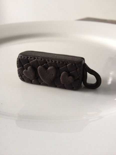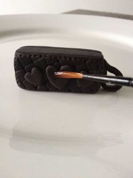 En primer lugar permite empezar con nuestra decoración de pastillaje y encontrar lo que queremos destacar, aquí he elegido un bolso mini y quiero el corazón para sacar abit más! Así que todo lo que haces es sumerja el pincel en el esmalte y limpie el exceso. Aplicar el esmalte a los corazones y eso es todo. Añadí abit extra en la parte superior, lados y maneje de la bolsa se seca suave y muy rápido.