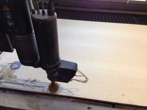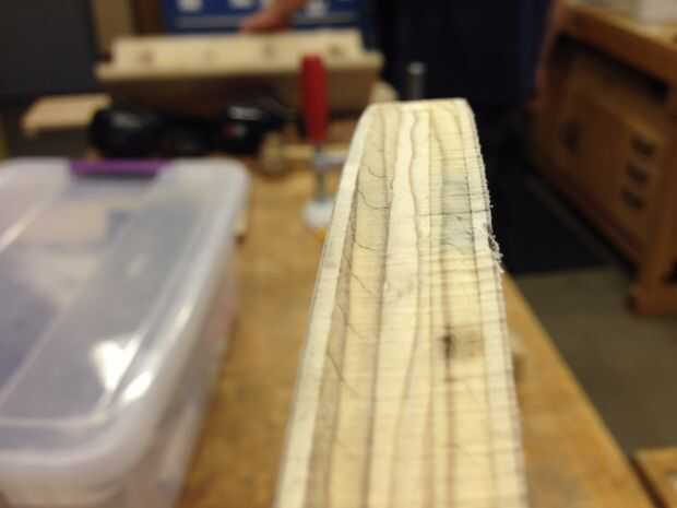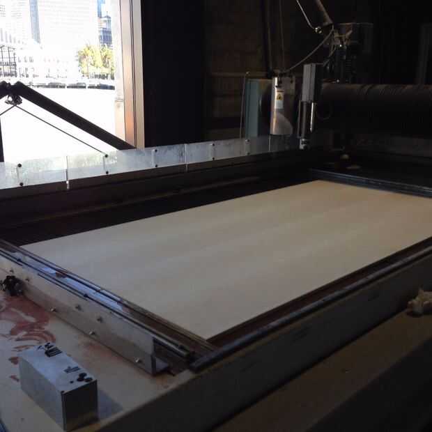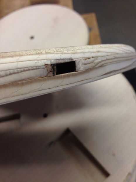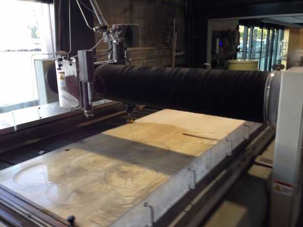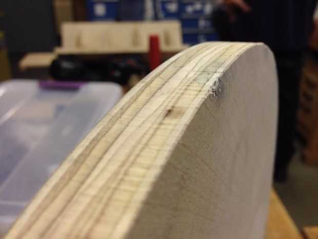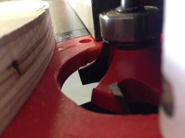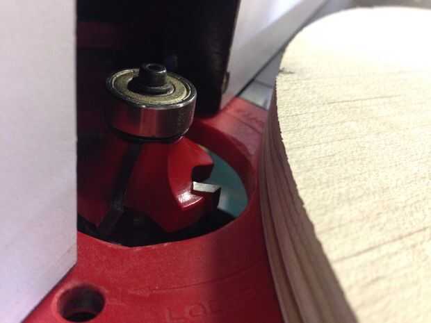 Filetean los bordes superior e inferior de la silla con la mesa de fresadora. Elegí una broca con un radio de filete que era aproximadamente la mitad del grosor del material (3/8" radio). Para piezas de asiento superior e inferior, filetean el lado de la madera que estaba boca abajo en el chorro de agua. ¿Por qué? El borde de la madera que bajaba la cara durante el corte de chorro de agua fue más bien irregular, mientras que el borde que subió la cara era liso. El borde liso debe montar contra la superficie de referencia - el cojinete de la broca, para tener un Lomo liso corte. Si se voltea la pieza, la superficie irregular del borde montaría contra el rodamiento, provocando un corte de filete irregular, desigual.