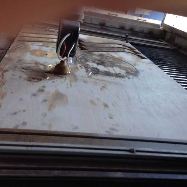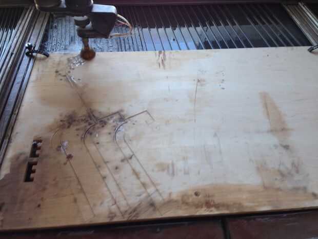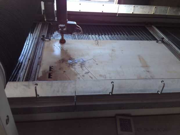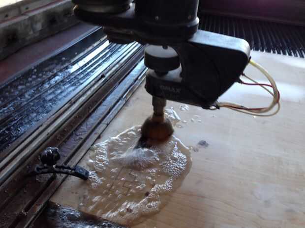 No estándar lo hice mientras el chorro de agua de funcionamiento fue mantener el nivel del agua baja. En la operación normal del chorro de agua, el nivel del agua se eleva sobre el material para reducir salpicaduras y sonido. Tenía miedo que empapar la madera contrachapada en la cama de agua elevada se descolora y deformación de la madera contrachapada. En cambio, corté la madera contrachapada con el nivel del agua baja. A pesar de esta precaución, el chorro de agua expulsado agua, granate y "lodos de chorro de agua" sobre la superficie del material, llevando a algunos decoloración.