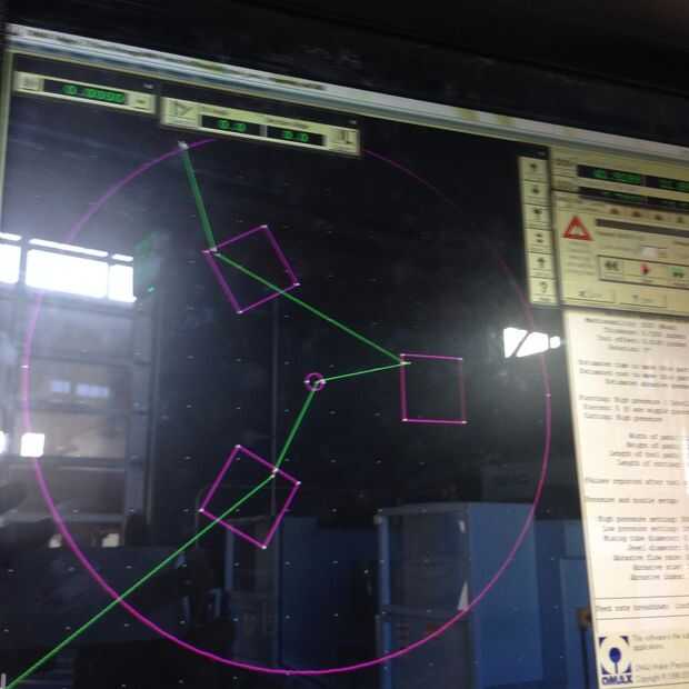 Luego preparé el chorro de agua OMAX 9 de muelle para el corte con el conjunto estándar de actividades: (1) activa la bomba de carga, (2) presión de la tolva granate, (3) carga de la madera en el agua jet, (4) sujetado en su lugar en la cama (5) aloja el xy y z coordenadas, (6) carga el archivo .ord creado por disposición OMAX, (7) establecer el material y el espesor del material en OMAX y (8) verificar los grados de la trayectoria de la herramienta para asegurarse de que la cabeza del chorro de agua no funcionarían en cualquier sujetadores.