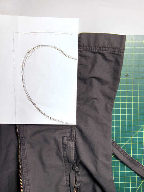 Pone la prenda plana y uso un pedazo de papel para dibujar el patrón para su bolsillo.  En mi caso, estaba limitado en el tamaño de la bolsa por la cremallera y la parte inferior de la chaqueta, que se puede ver dibujada en el papel.  El bolsillo puede ser bastante cerca del dobladillo o cremallera, pero deja un poco de espacio para evitar la posibilidad de que quede atrapado en la cremallera, o mostrar debajo del dobladillo.  También, asegúrese de probar los bolsillos al coserlas en el paso siguiente-es fácil hacerlos demasiado pequeño (que la primera vez alrededor).