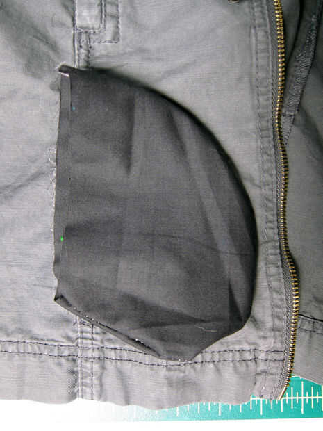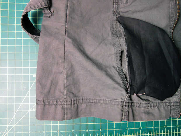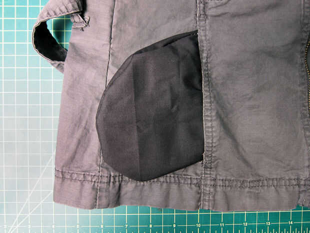 Ahora la parte difícil. Primero, gire el bolsillo de adentro hacia afuera y pone en la orientación que será terminada en la parte delantera de la prenda, como se muestra en la primera foto.