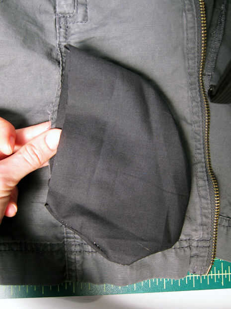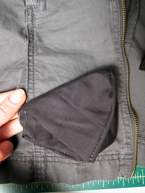 La primera costura a colocar la capa inferior de la bolsa a la capa superior de la chaqueta, que están entre mis dedos en la primera foto. Perno de la costura en su lugar y cosa. Tener mucho cuidado hacer de su nueva línea de costura exactamente en línea con la original línea de costura, como especialmente con esta chaqueta hay una línea de pliegue fuerte y dificultades para colorear el borde de la costura que mostrará si la costura es torcida. Me pareció más fácil de coser con la chaqueta hacia arriba, como que me ha permitido seguir la línea original de costura más fácilmente. Coser lo más cerca posible de la parte superior e inferior del bolsillo. Cuando haya terminado, la pocket debería verse como las dos últimas imágenes.