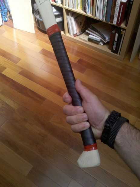 Recientemente recibí a una nueva hurley, el palo solía jugar hurling. Llegó con un mango de Fresno liso así que decidí añadir alguna cinta de agarre. Esto hace que la empuñadura un poco más grande alrededor y mucho más fácil para algunas personas a colgar a. Especialmente cuando la hurley se moja.