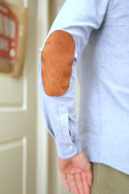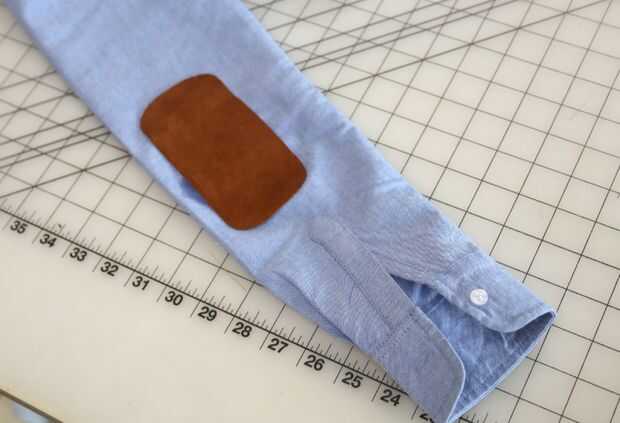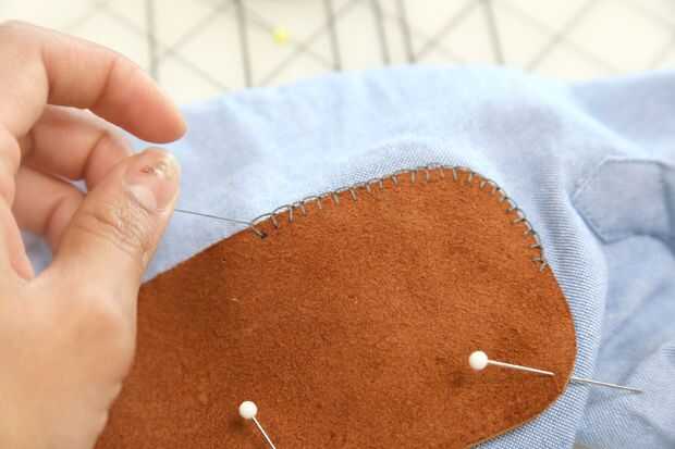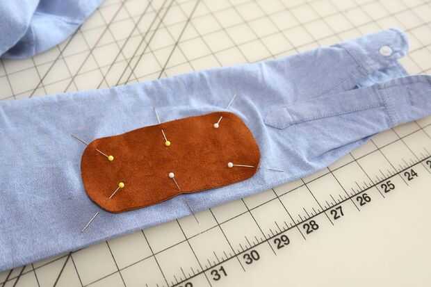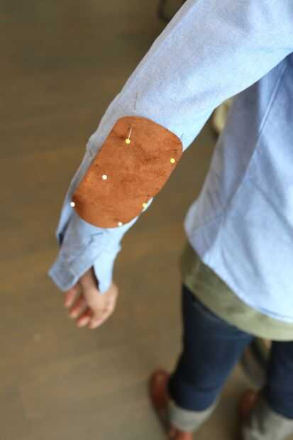 Utilizando una gamuza marrón que estaba seguro sería fray no alrededor de los bordes, colocar el parche sobre la camisa y puestas en su lugar. Traté de la camisa en este estado para confirmar que el parche se coloca correctamente. Si usted está tratando de averiguar cómo hacer mejor el parche, calzarse la camisa/jersey y con un poco de agua mojado el lugar exacto de su codo. Esta zona húmeda debe corresponder con el centro de su parche. Prender el parche hasta la camisa/jersey con recta alfileres o imperdibles (recomiendo esta última ya que el parche puede cambiar de posición mientras está cosiendo en)