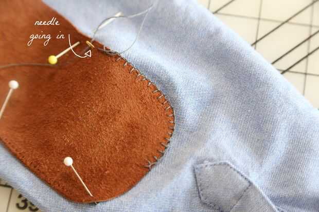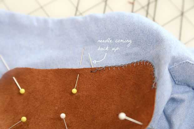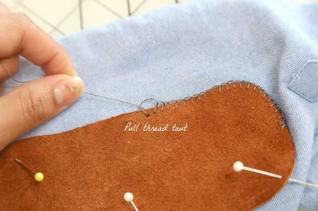 Ahora a coser! Usé una variante de la puntada de manta todo el camino alrededor del borde del parche de gamuza. Ya que no estaba preocupado con la gamuza se deshilache, podía tratar los bordes como terminado.