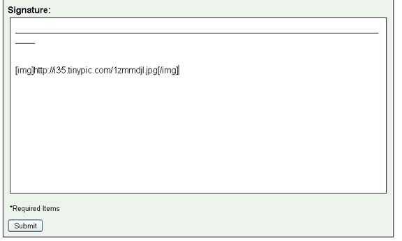 Ir al "Centro de Control" y seleccione la opción "Editar firma".   Pega la dirección de la imagen que desea utilizar en su firma y soporte con [img] [/img] (ver imagen abajo).  Luego pulsa "Enviar."