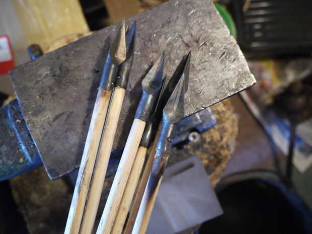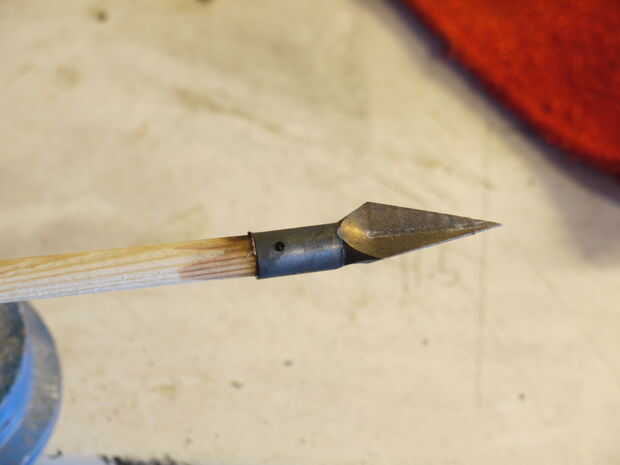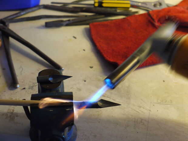 Ahora necesitas calor tratar la cabeza. la cabeza está colocada en el eje, así todo es bueno. Coge la antorcha y calentar la cabeza. no la toma ahora, pero la cabeza. Haz la punta de la cabeza sea una bonita rojo cereza (no naranja o amarillo, demasiado caliente) pero más bajo abajo de la cabeza sólo tiene que ser gris. Entonces apagan la cabeza en aceite. Temple en aceite hace que el metal solo tan duro como el Temple en agua, pero sin hacer más cristalino la estructura atómica.