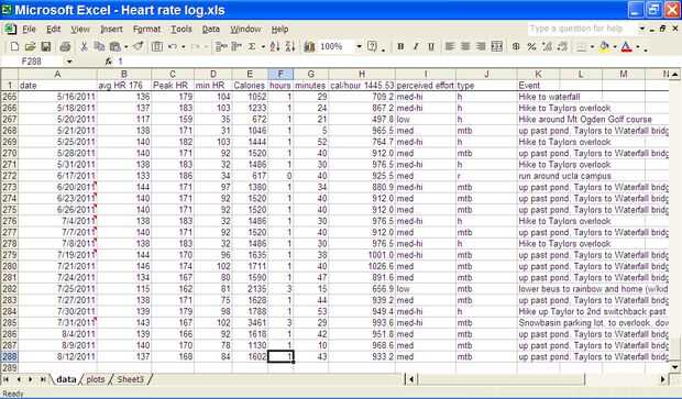 Calculo ' calorías/hora "con el excel fórmula"= E2/(F2+G2/60)"donde 'E' es la columna de" calorías, 'F' está horas y 'G' minutos. Yo copie y pegue entrenamientos mayores y similares para guardar algunos escribiendo.