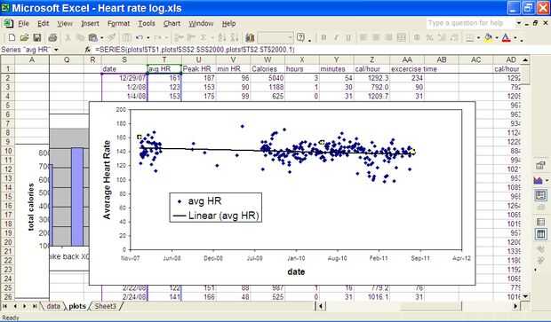 En este terreno que uso Mostrar mi frecuencia cardíaca promedio durante los años. La línea es una regresión lineal (o simplemente una línea definida matemáticamente que mejores ajustes todos mis datos).