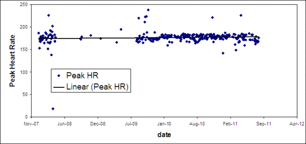De estos datos veo que mi frecuencia cardíaca máxima es de 175. No parece que han bajado como conseguí más viejo. La ecuación estándar para encontrar su ritmo cardíaco máximo es 220 - edad. Pero estos datos muestran un plano máximo ritmo cardíaco, aunque esto es solo 5 años o así.