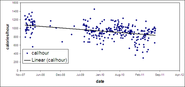 Aquí veo que realmente estoy frenando. Una alta calorías/hora significa que estoy trabajando realmente duro hacia fuera. Mi tendencia es caer un poco de aproximadamente 1100 calorías/hora a 900 calorías por hora.
