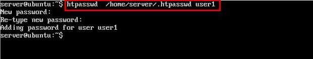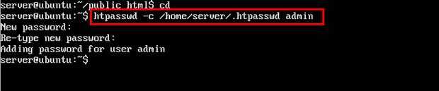 Asegúrese de reemplazar el nombre de usuario con el nombre de su servidor, al igual que anteriormente. También sustituir la palabra usuario con cualquier nombre que usted desea. El nombre especificado en el campo de usuario se utiliza como el nombre de usuario para la nube. En mi ejemplo, utilizo el administrador de nombre. Una vez introducido, el servidor creará el archivo .htpasswd y le pedirá una contraseña para el usuario especificado. Introduzca y confirme su contraseña para continuar.