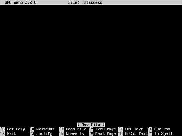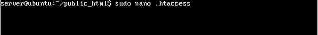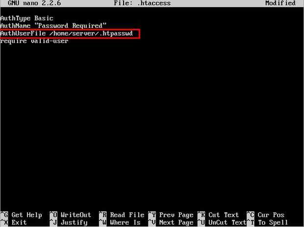 No te olvides del '.' antes el htaccess. El punto oculta el archivo de usuarios. Este archivo le indicará que el servidor Web que se requieren un nombre de usuario y contraseña para acceder a la nube. Nano abrirá un archivo en blanco llamado .htaccess al introduce el comando anterior. En el tipo de ventana: