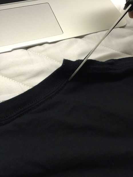 Tenga mucho cuidado al cortar justo por debajo de la costura. Cortar todo el camino alrededor del cuello de la camisa hasta la costura y el cuello han desaparecido.