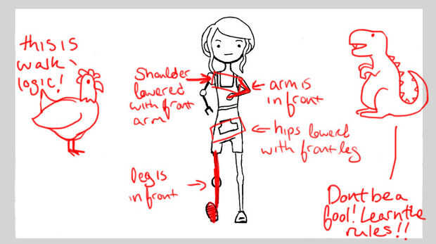 La última ilustración que he hecho de todos los fotogramas clave participa en mi ciclo de a pie. Una vez que entienda cómo funcionan estas cajas invisibles, es bueno pensar también en cuánto tu personaje menea arriba y abajo mientras caminan. Un personaje con una alegría casi-skip se moverá hacia arriba y hacia abajo bastante, mientras que un personaje que tal vez sea tímido y arrastrando los pies apenas se mueve pero todavía tienen que pasar. Si he visto nunca un paseo ciclo donde una bomba de las piernas de caracteres y oscilación de los brazos, pero su torso flota a lo largo sin flotando en todos, usted sabrá cómo muy incómoda y antinatural parece--a menos que tu personaje es un fantasma. En la última foto, he añadido la cuesta que la mayoría de los caminantes bob hacia arriba y hacia abajo. Es la línea grande que parece un poco a un bigote. Como se puede ver, su altura es mayor cuando una de sus piernas está completamente extendida. Tal y como se convierte en la pierna derecha totalmente recta y el pie derecho reúne a la tierra (el primer fotograma de la ilustración), se crió en altura, pero como aplana su pie izquierdo y su pie derecho levanta (segundo cuadro) pierde altura. Ella vuelve esta altura como su pierna izquierda se convierte en recto, y el ciclo continúa.