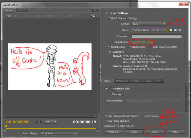 Sólo lo dejó ahora es exportarlo en un formato amigable de Youtube. Esto es muy fácil, sólo tienes que hacer es soltar el menú de archivo abajo, flotar sobre exportación y seleccione los medios de comunicación. Se abrirá una nueva ventana donde puede seleccionar cómo el vídeo se exportará. Asegúrese de que la opción de formato es H.264 y el Preset es Youtube Widescreen HD. También, puedes nombrar tu animación usando la opción nombre de salida. Cuando estás seguro tienes tu derecho de configuración, exportación al final del golpe. Ahora aparecerá una barra de progreso, y cuando ha terminado, usted tendrá un ciclo hermoso, de buena fe. Voila!