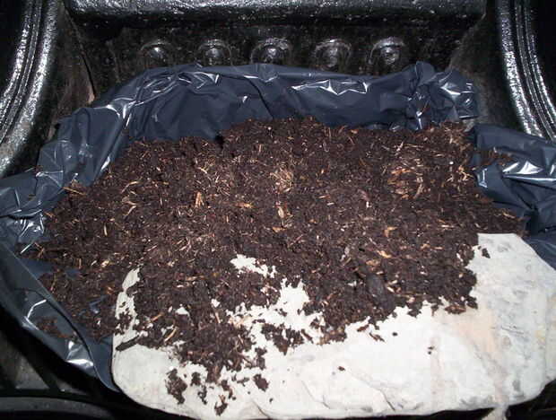 Rasgar su binbag de modo que el binbag asentada en su chimenea con el borde de la bolsa apenas sobresaliendo de salida. Llene con compost. He utilizado una piedra para pesar abajo o cosas podrían tienes desordenadas. Sólo el compost con la mano o el utilizar una llana si quieres.