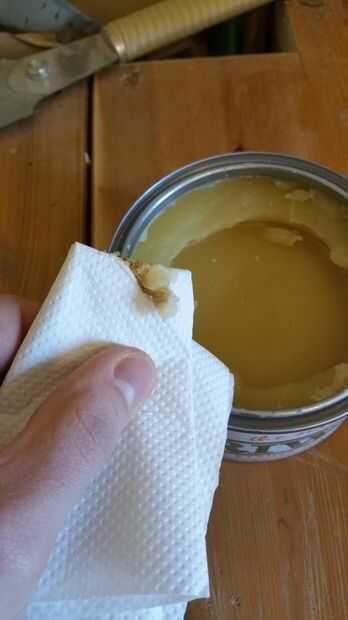 Ahora que la superficie de la madera ha sido correctamente preparada, el puede empezar a aplicar la cera. Aquí he utilizado sólo un poco en la toalla de cocina y frotado en la madera en todas las direcciones para entrar en el grano realmente bien.